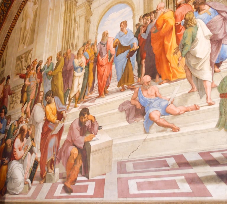 Raphael painted Michelangelo into this fresco as the 'melancholy who slept with his boots on'...