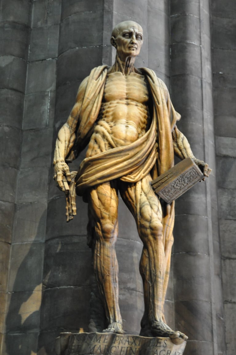 Statue of St. Bartholomew in the Duomo. He was skinned alive and is depicted by Michelangelo in the Last Judgement as well. He is draped in his skin.
