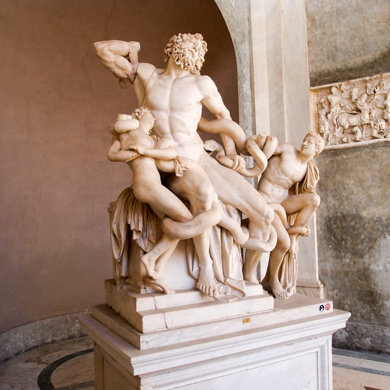 Among all the pagan sculpture in the Vatican, this one struck me in particular. Laocoon was a priest of Apollo who foresaw the Trojan trickery at Troy and warned Aeneas. Poseidon and Athena, partial to the Greeks, sent two sea serpents to kill Laocoon and his two sons. Aeneas heeded Laocoon's warning, fled Troy, and eventually founded Rome.