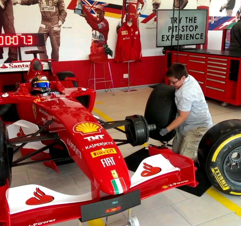 Damon taking the pit crew challenge and the only proof that we got to see the Ferrari factory and Fiorano test track as no pictures were allowed once on the bus. We did see a camouflaged prototype and some WIP cars.