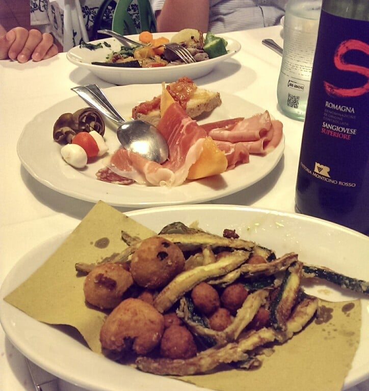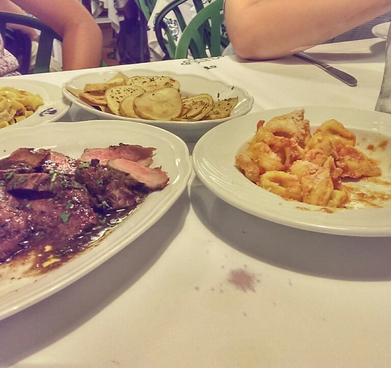 Antipasti verdure, antipasti della casa, tortellini in brodo, tortellini in red sauce, tagliatelle ragu, fillet, and a great house Sangiovese. Cristina saw us drinking the tortellini broth from the bowl and gave us the youtube link to her recipe - but no broth! MAGNÈR A BULÅGGNA (Còt e magnè) - Terza Puntata: i Tortellini
